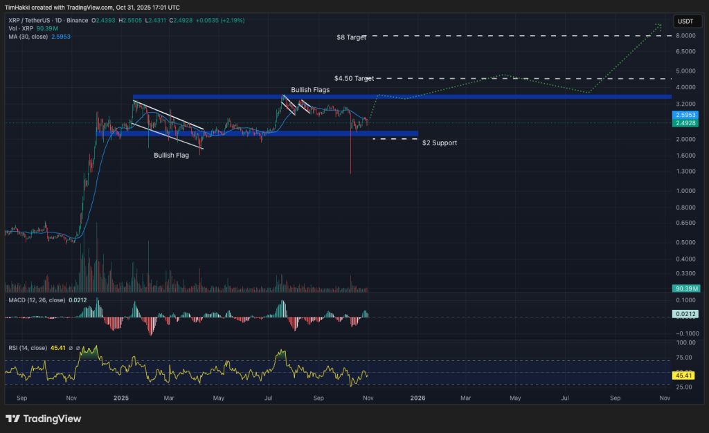 Several bullish flag setups have formed across XRP’s 2025 price charts, hinting at sustained technical momentum.
