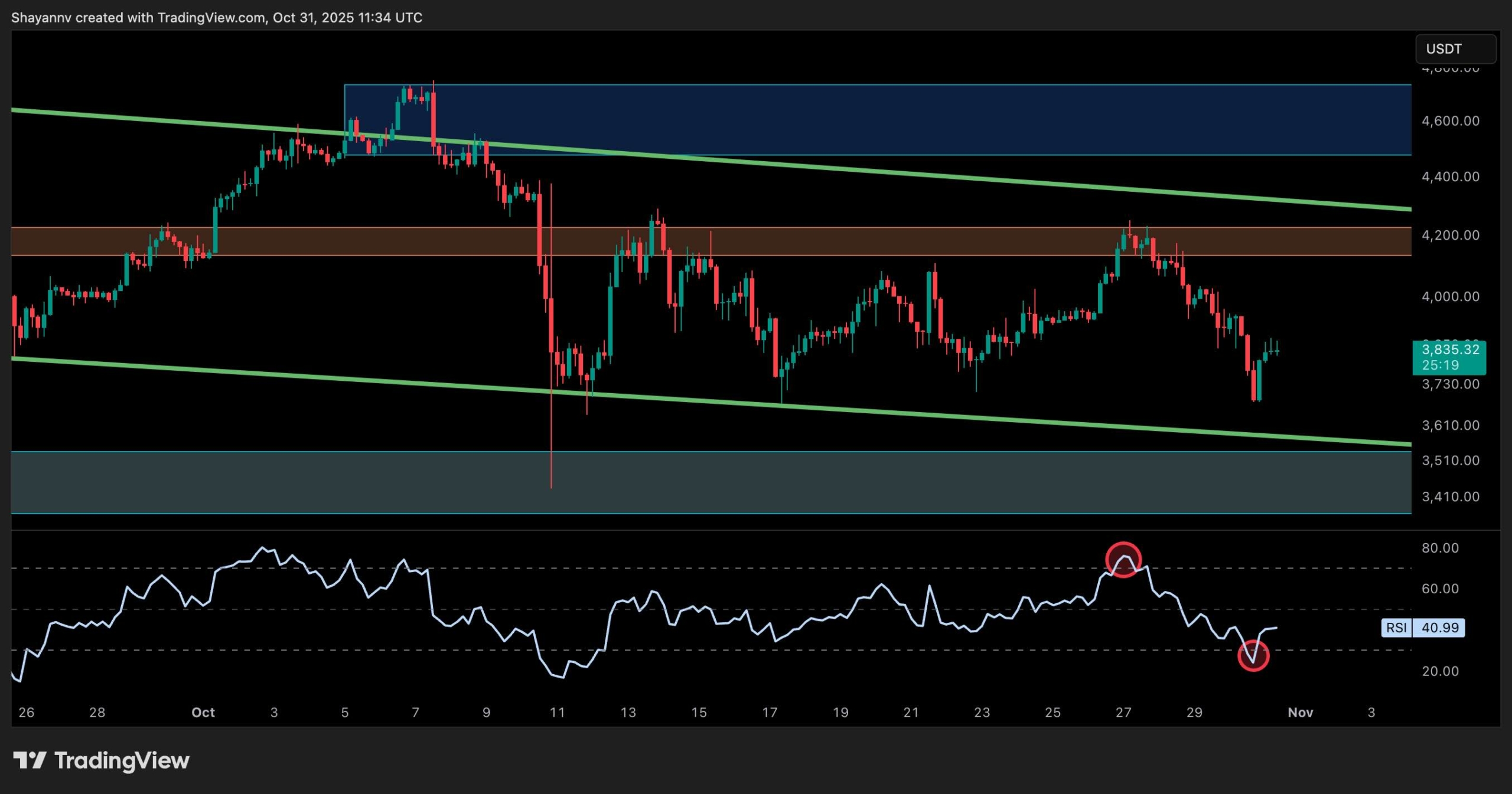 The RSI on the daily has also dropped to around 42. This reflects a cooling off in buying pressure without yet entering full oversold conditions. If ETH loses the $3,700 support, the next major demand zone lies around $3,400, where the lower channel support and a horizontal level intersect. However, if buyers can reclaim the $4,000 region, another test of the $4,200 level would be very likely.