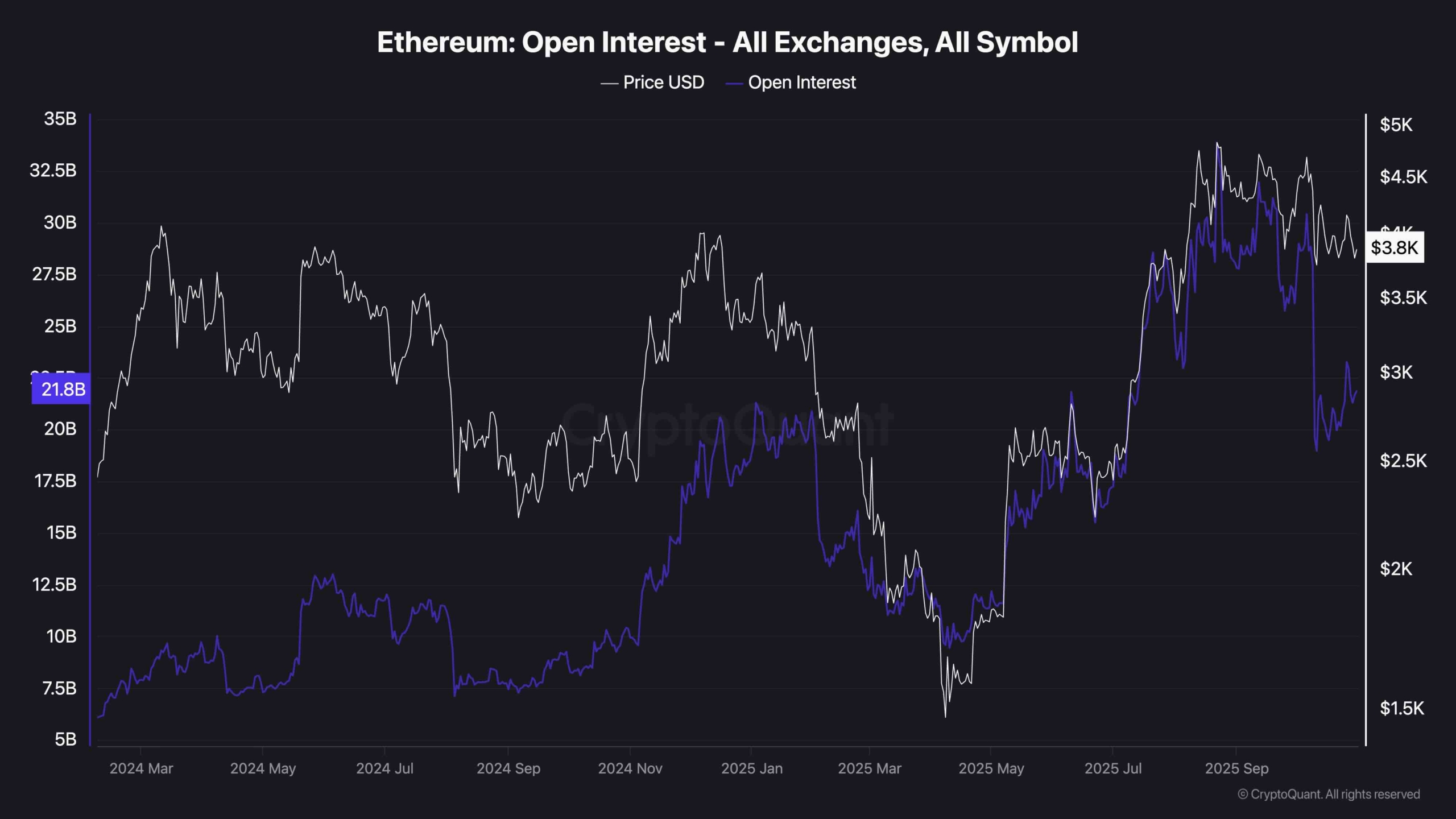 Open Interest on Ethereum has seen a significant reset, falling sharply from over $32 billion down to around $22.8 billion. This drop reflects a broad deleveraging across the market, likely triggered by a combination of stop hunts, liquidations, and risk-off behavior from traders. The rapid flush of open positions suggests that many overexposed longs were forced out, especially after ETH’s rejection from the $4,200 resistance area.
